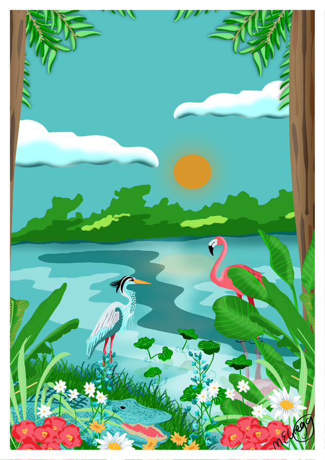 Bring the beauty of the Everglades into your home with this vibrant tropical wildlife art print. Featuring a graceful heron and flamingo by a serene lagoon, surrounded by lush greenery and blooming wildflowers, this artwork captures the colourful spirit of Florida’s iconic wetlands.