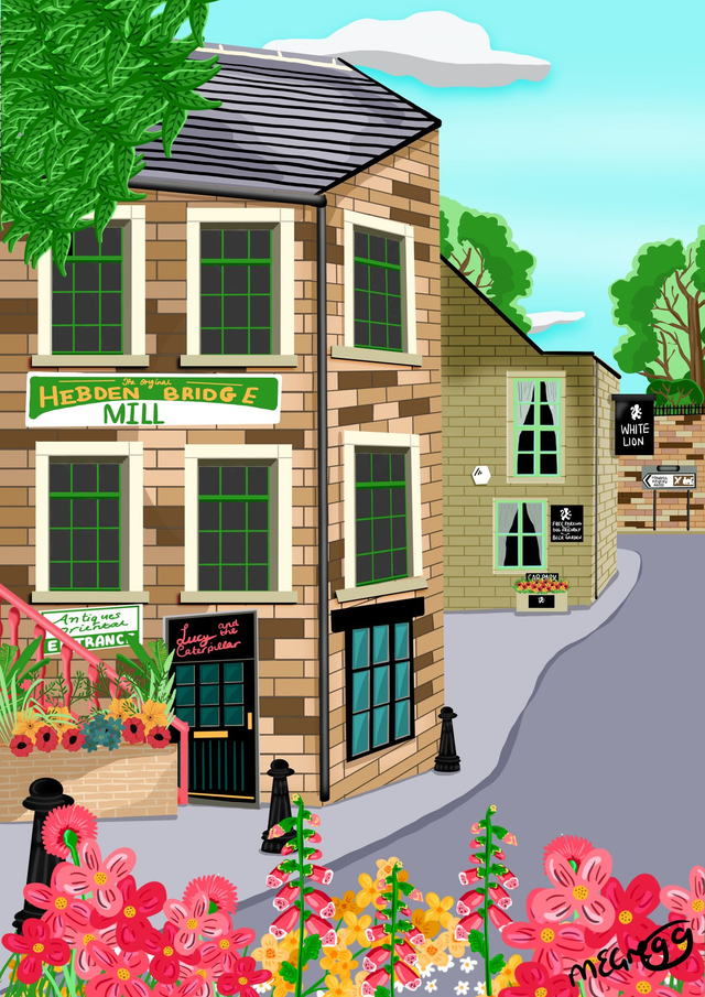 This digitally illustrated art print features The Mill and the White Lion pub in Hebden Bridge, West Yorkshire, reimagined in Marie Gregg’s expressive, hand-drawn style.